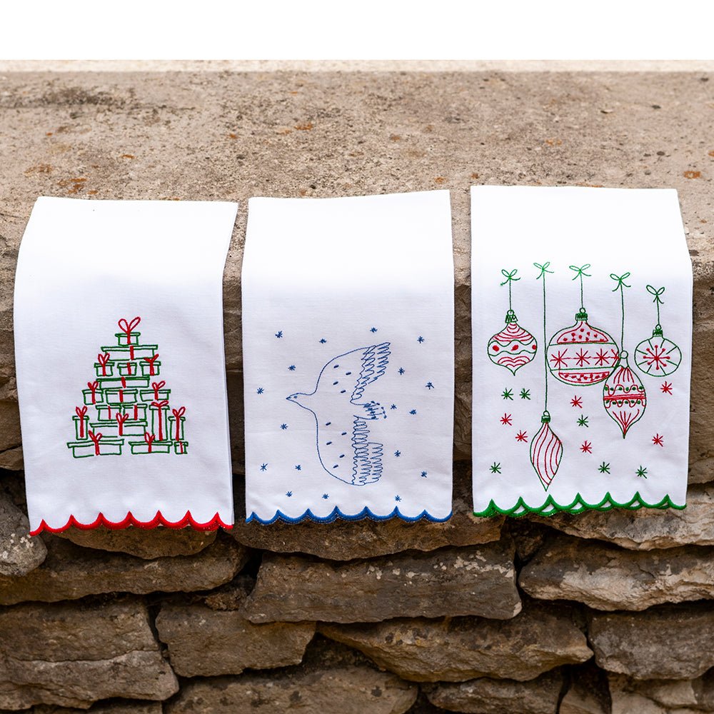 Embroidered Hunt Scene Red Ribbon Tea Towels