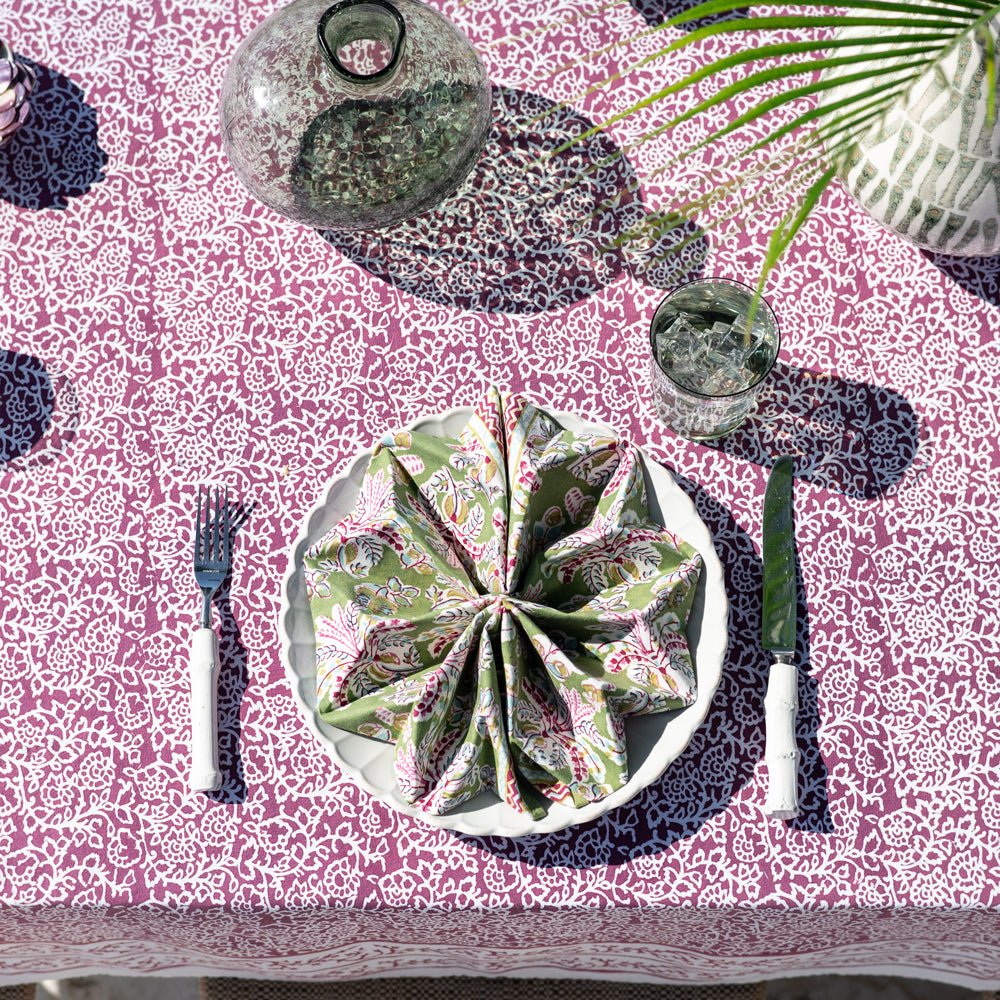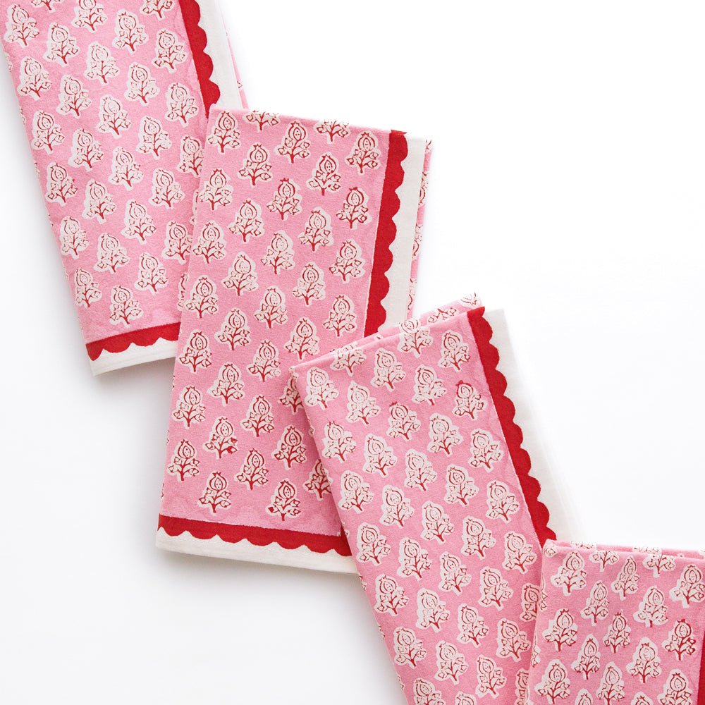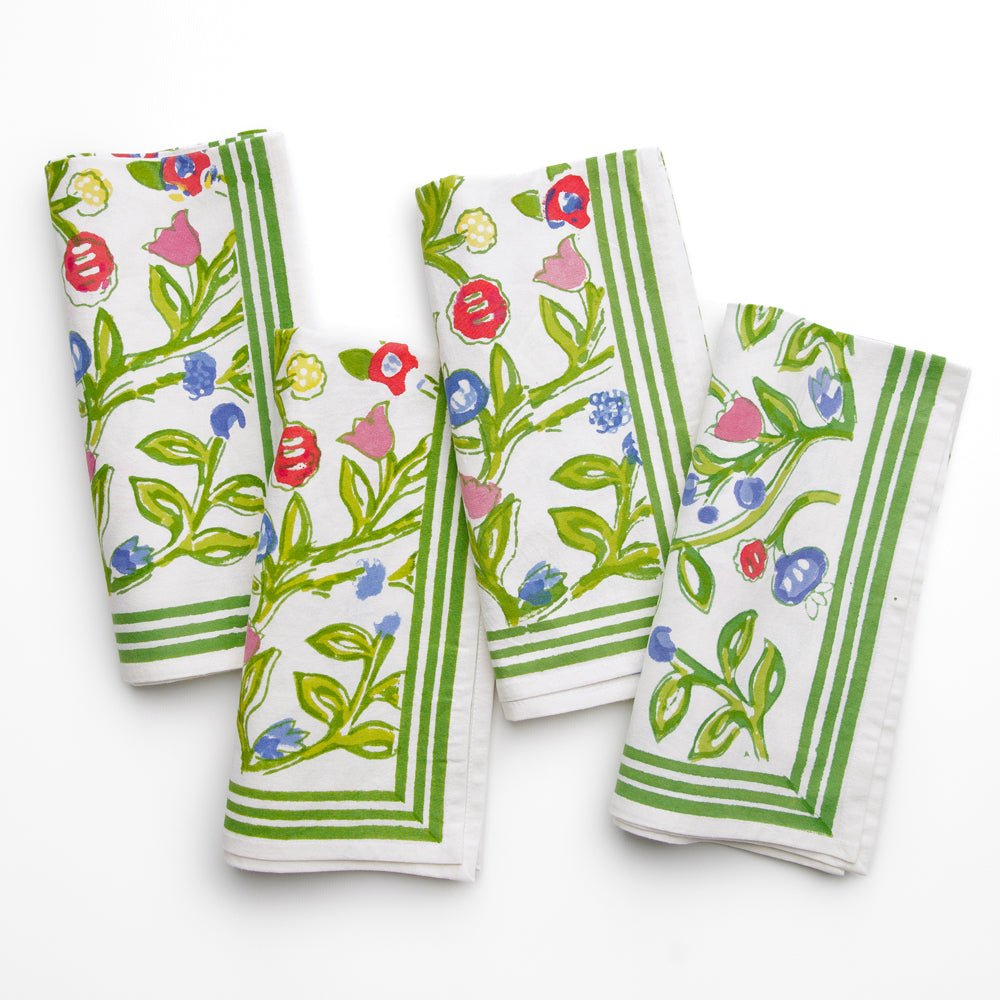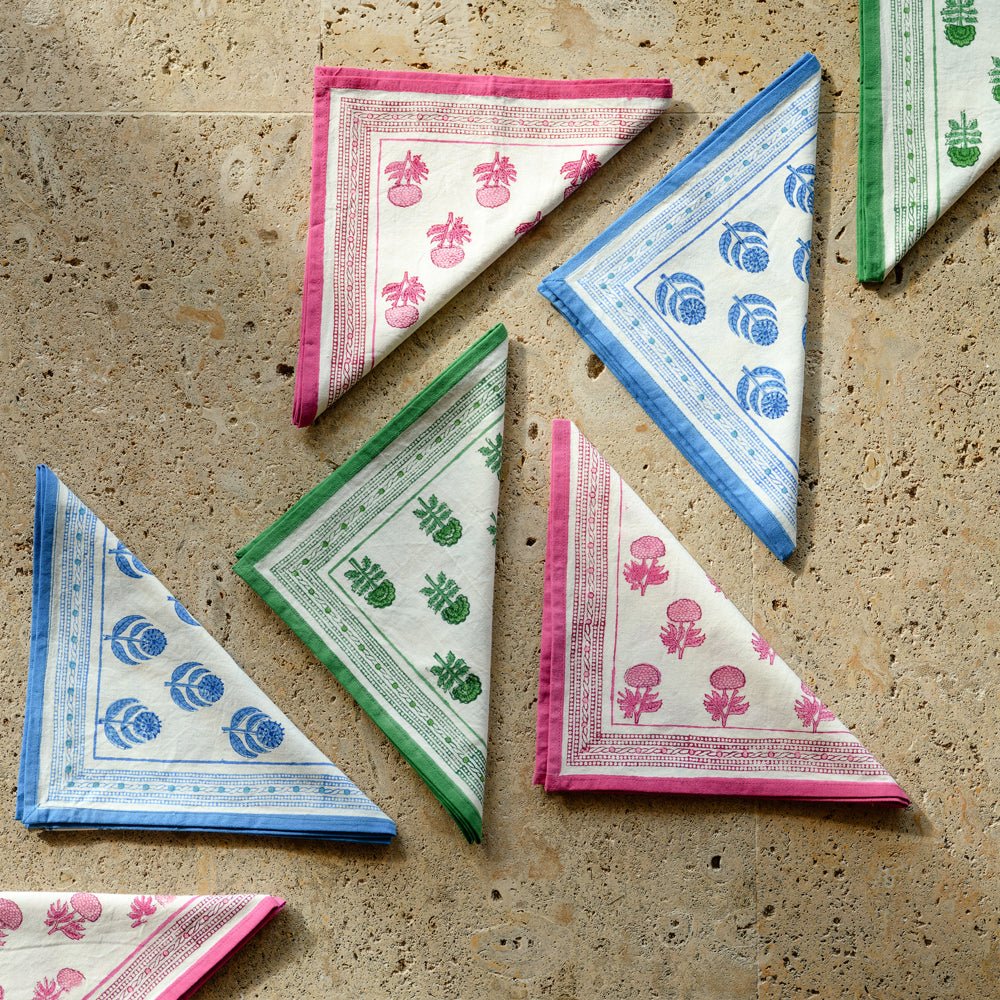 Our classic hand block-printed cotton napkins and elegant linen napkins are timeless Pomegranate staples. Featuring refreshing floral and geometric prints, each cotton napkin is hand-printed in vibrant colors, while our linen napkins are beautifully embellished with embroidery, scalloped edges, and decorative borders. Crafted by skilled artisans, these 100% cotton and natural linen napkins add the perfect hostess touch to everyday meals or festive gatherings. As signature pieces within our expanding table linens collection, Pomegranate napkins bring color, craftsmanship, and distinctive style to any tablescape.