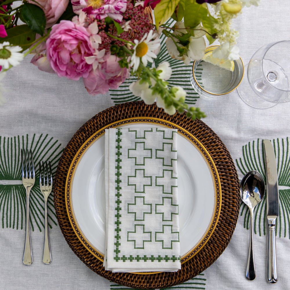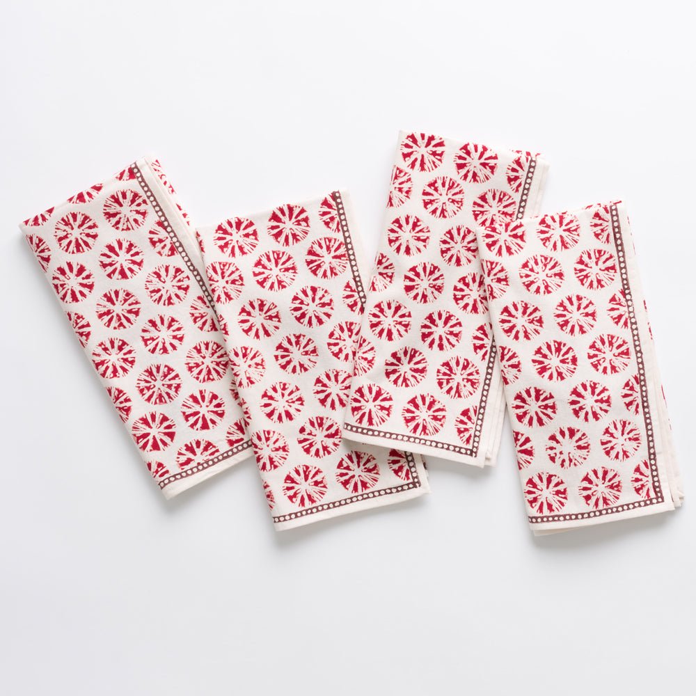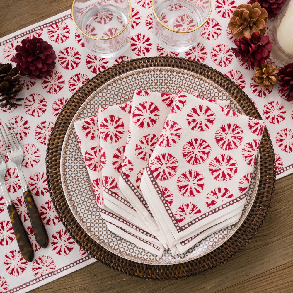 Our classic hand block-printed cotton napkins and elegant linen napkins are timeless Pomegranate staples. Featuring refreshing floral and geometric prints, each cotton napkin is hand-printed in vibrant colors, while our linen napkins are beautifully embellished with embroidery, scalloped edges, and decorative borders. Crafted by skilled artisans, these 100% cotton and natural linen napkins add the perfect hostess touch to everyday meals or festive gatherings. As signature pieces within our expanding table linens collection, Pomegranate napkins bring color, craftsmanship, and distinctive style to any tablescape.