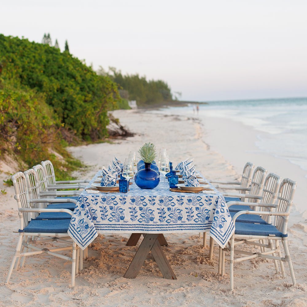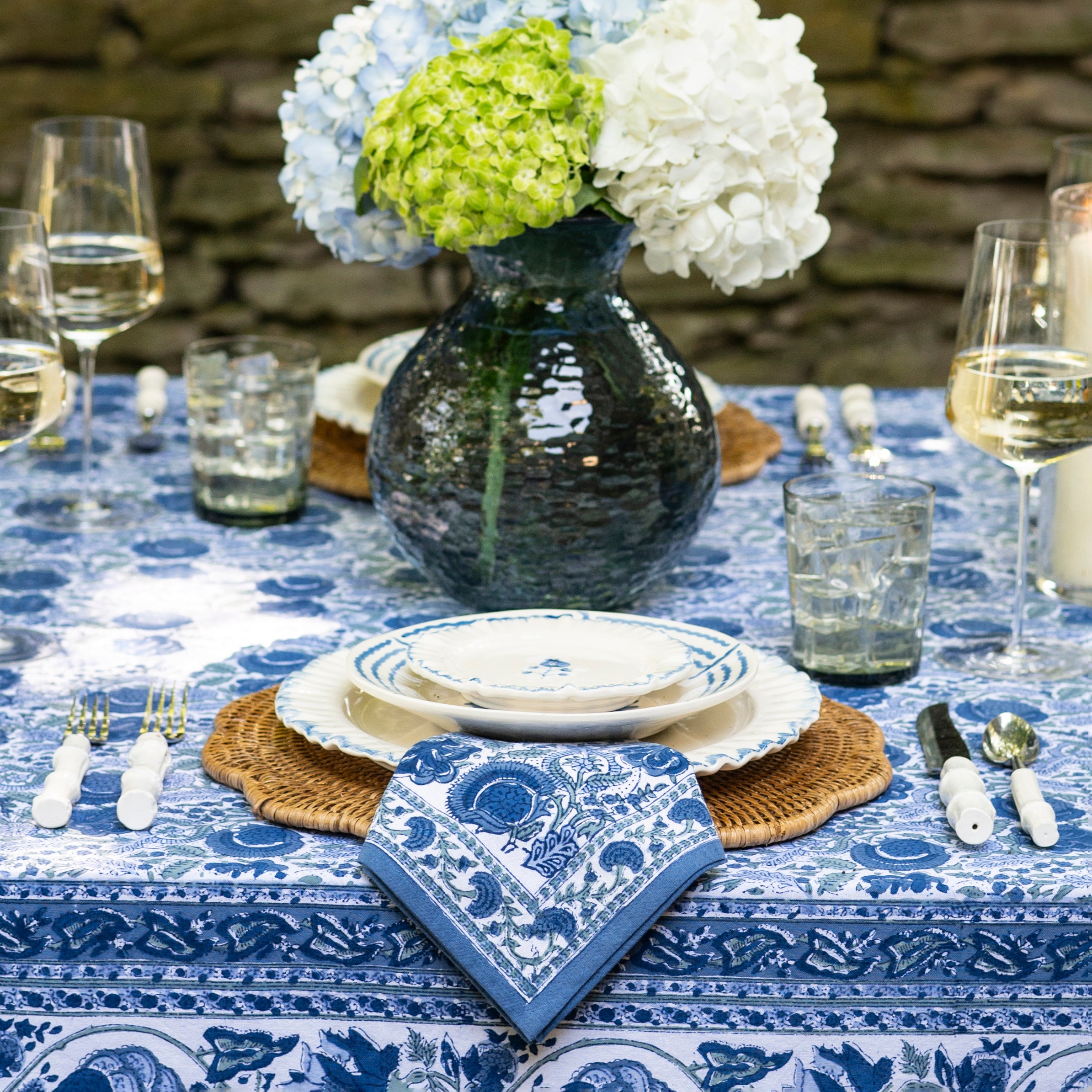 Our blue and white collections feature timeless hand block-printed table linens and coordinating tableware that never go out of style. From elegant tablecloths and chic cloth napkins to placemats, runners, melamine dishes, and glassware, each piece is crafted for beauty and practicality. With shades ranging from classic navy to soft baby blue, these versatile designs complement any décor and occasion. Whether you’re hosting a formal dinner party or a casual brunch, our blue and white linens and accessories are easy to style, easy to care for, and always effortlessly elegant.