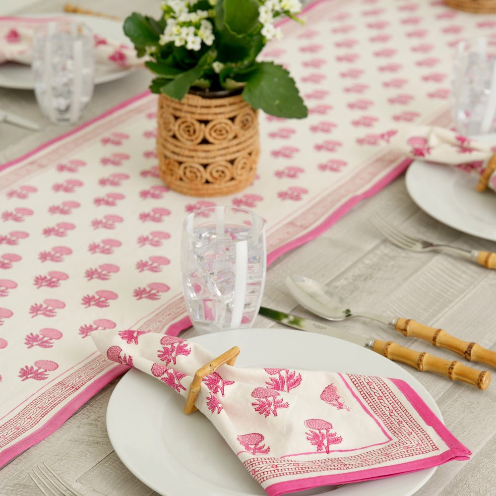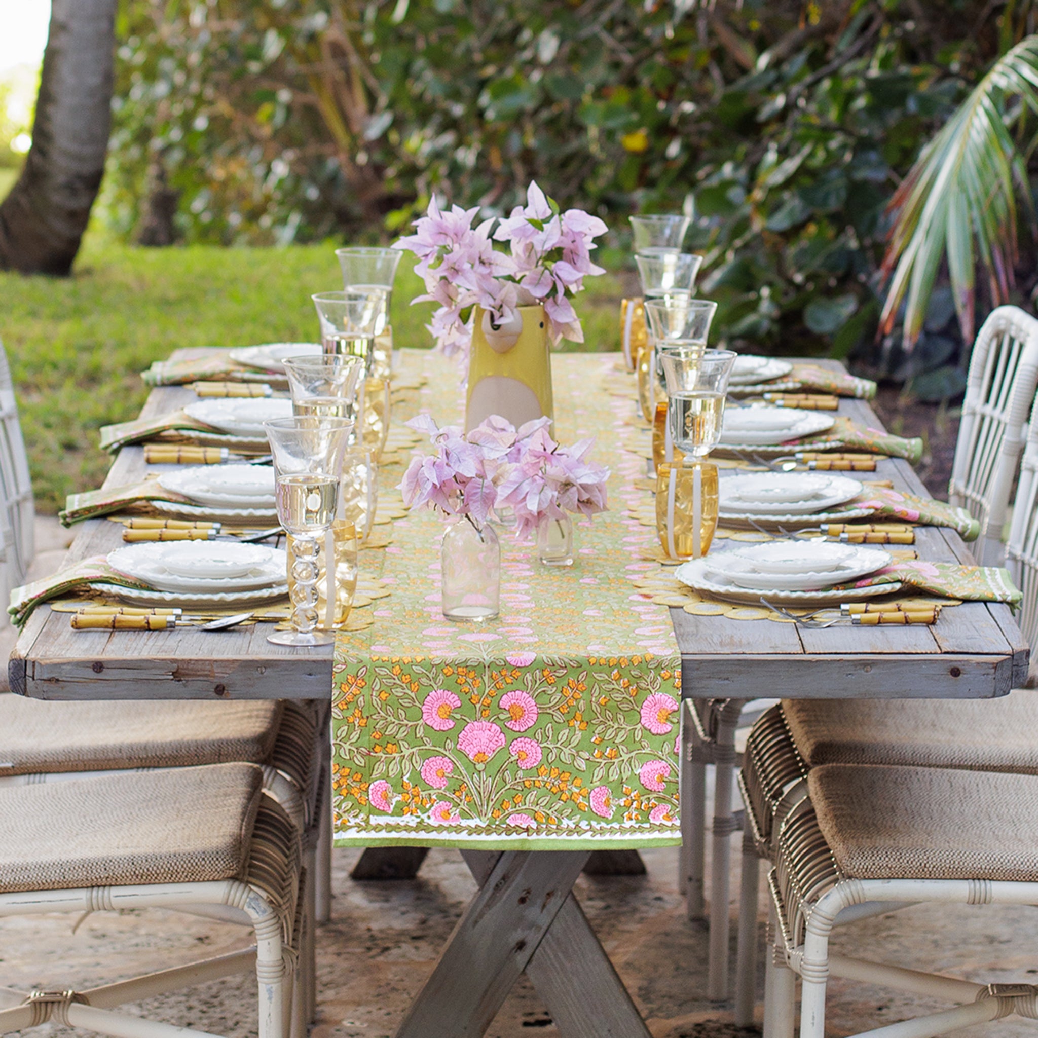 Pomegranate table runners bring a fresh pop of color and pattern to any dining table. Hand block-printed on 100% cotton with vibrant floral and geometric designs, our runners are the easiest way to refresh your decor and instantly change the look and feel of a room. Perfect for layering with matching tablecloths or napkins, each runner is artisan-crafted to add warmth, style, and personality to your tablescape—whether for everyday dining or special occasions.