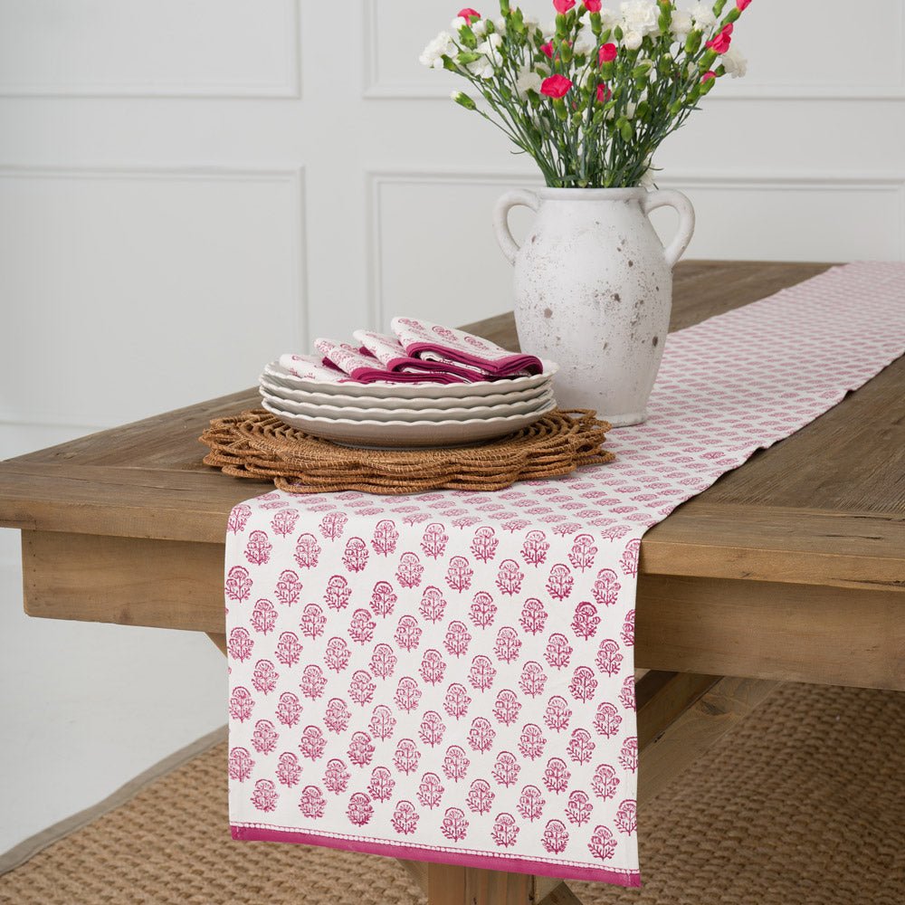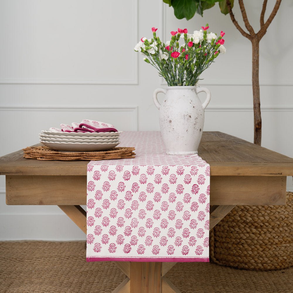 Add a splash of springtime charm to your table with our Anika Fuchsia Table Runner. Each piece is meticulously hand block printed with a dainty floral design, making it a stunning addition to any dining room. Made from durable fabric, this runner is perfect for everyday use or special occasions.