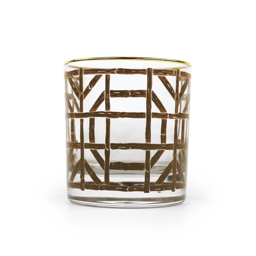 Graphic, yet sophisticated, our Brown Bamboo Bourbon Glass features a hand-applied decal wrap of a geometric bamboo pattern and a gold metallic rim that dresses it up for a special occasion while still practical enough for everyday use too.