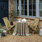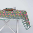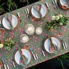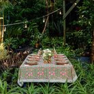 Cool and earthy, this lush botanical green print highlighted with pink blossoms and citrine leaves is perfect for day to night. Sit around your table with boho chic rich hues. Pomegranate tablecloths are casual and elegant, and offered in assorted sizes.