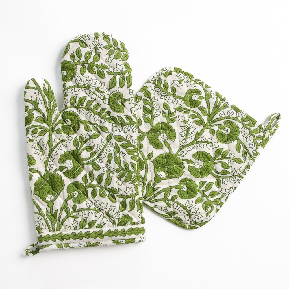 Protect your hands in style with the Cactus Flower Lettuce Green Oven Mitt Set. These mitts feature a stunning hand block printed design in green, bringing a burst of color and pattern to your kitchen. Made from 100% cotton, they offer excellent heat resistance and comfort, ensuring you can handle hot dishes with ease. Functional and fashionable, these oven mitts are a delightful addition to any kitchen.