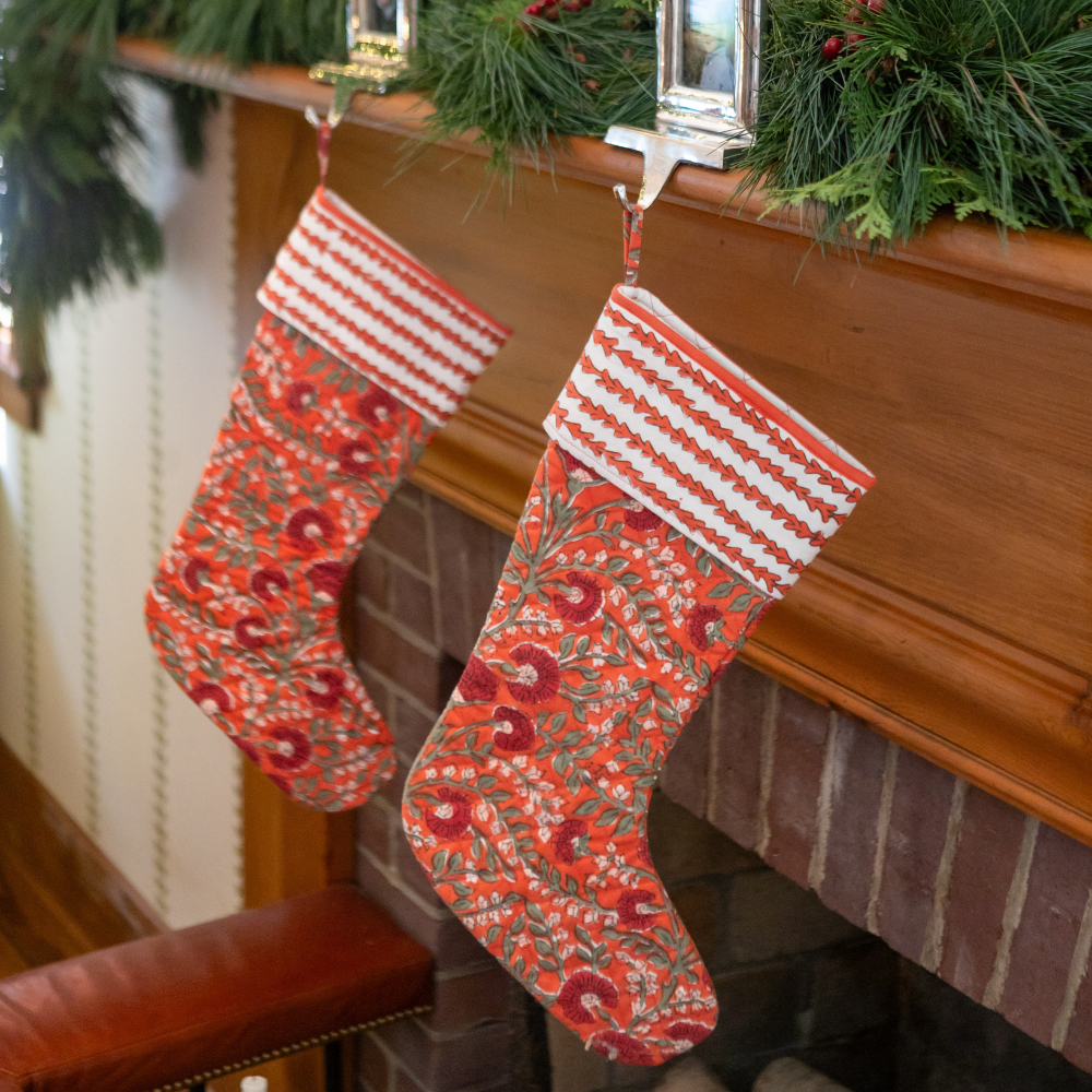 Hang this keepsake-worthy Cactus Flower Red Quilted Stocking by the fireplace for a touch of handcrafted holiday beauty. Hand block printed with a lively red floral design and finished with quilted detailing, it blends tradition and artistry in every stitch. Perfectly sized for small surprises and seasonal treats, it’s a festive favorite you’ll cherish year after year.