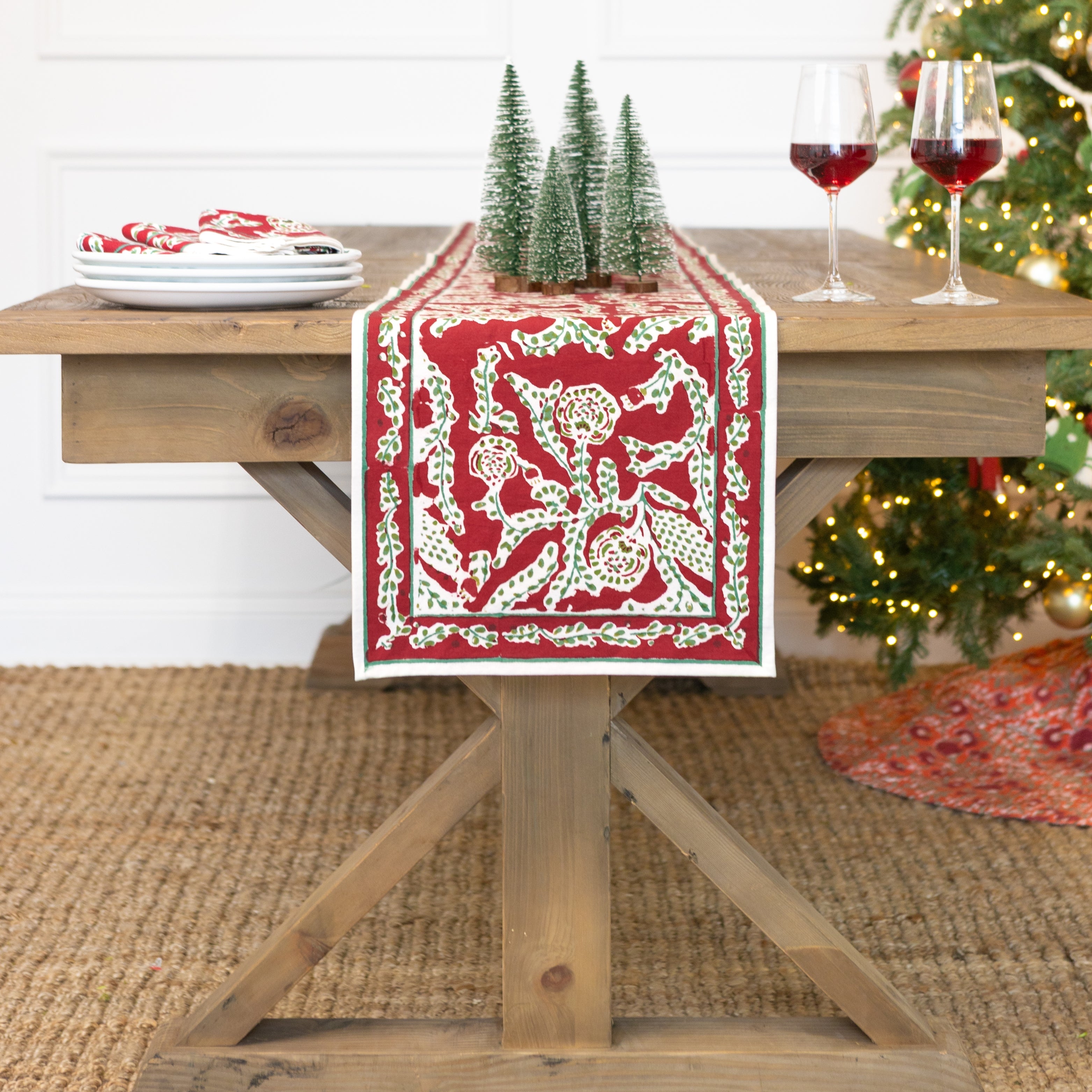 Set the scene for the holidays with our Climbing Dahlia Cranberry Table Runner. Hand block printed in vibrant shades of cranberry red and green, this runner creates a beautiful backdrop for festive gatherings. Whether paired with glowing candles or natural greenery, it’s the perfect foundation for your holiday table.
