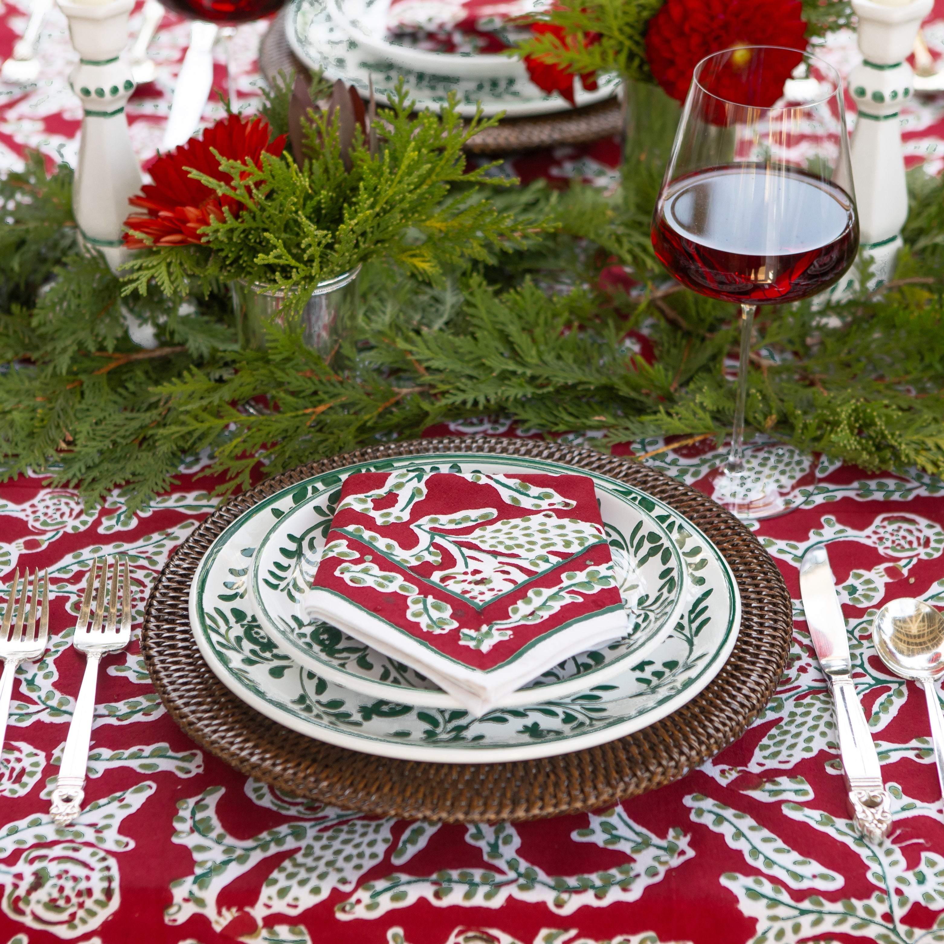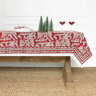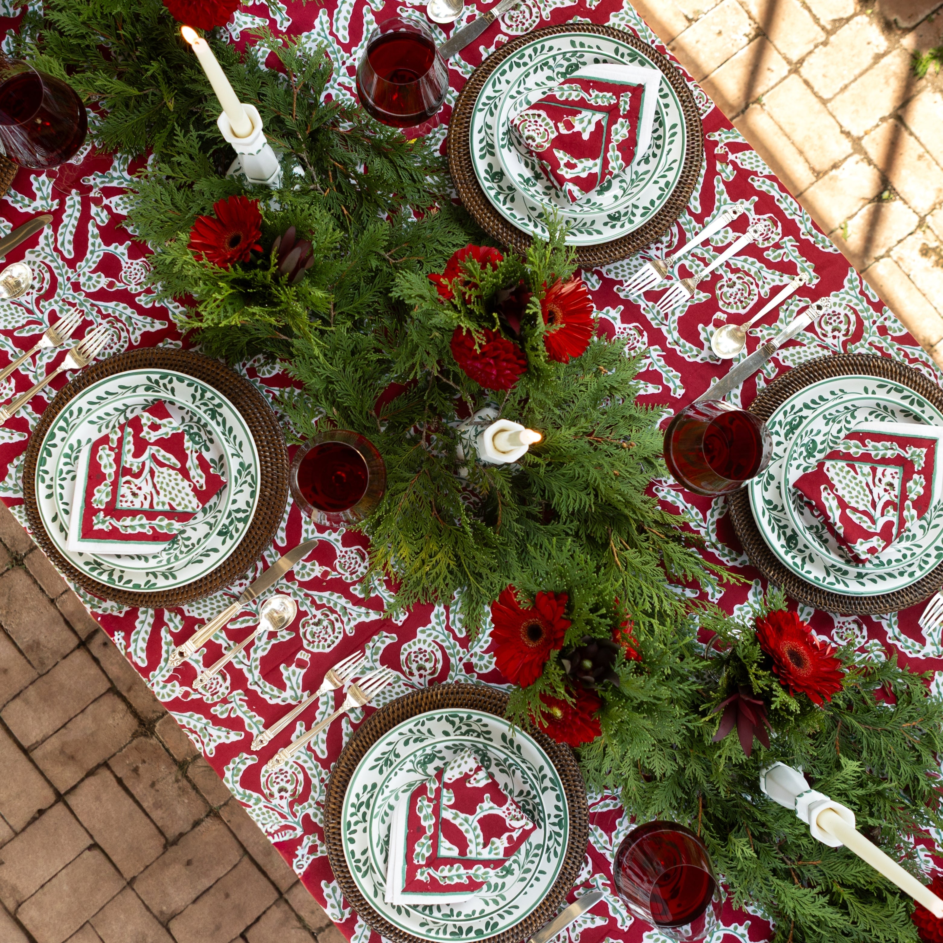 Make every meal feel like a celebration with our Climbing Dahlia Cranberry Tablecloth. Hand block printed with bold dahlias in radiant red and green, this cotton tablecloth brings holiday cheer to casual dinners and formal gatherings alike. A timeless design that shines all season long.