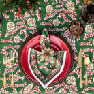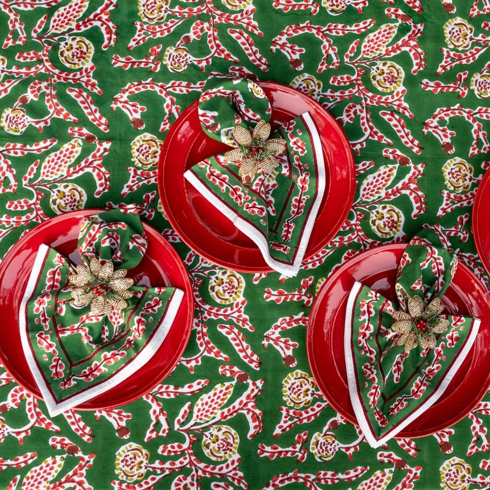 The Climbing Dahlia Emerald Green napkin set will elevate your holiday tablescape with its rich, beautiful design. This set of 4 napkins showcases an intricate hand block-printed pattern of bold dahlias and graceful vines, framed by a striking border. The deep emerald green background contrasts beautifully with the red floral design, creating a look that’s both lively and refined. Made from 100% cotton, these napkins are soft, durable, and machine washable—perfect for Christmas dinner, special gatherings, as well as everyday meals.