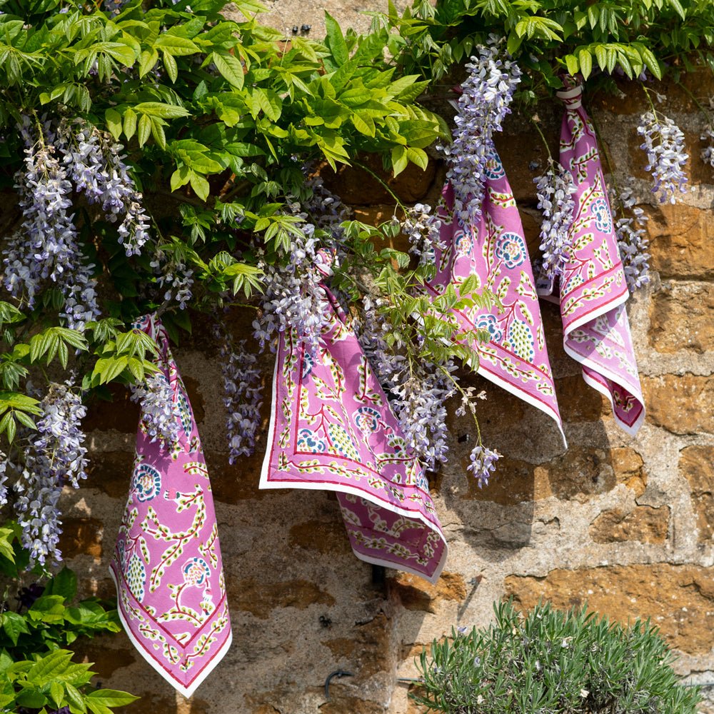 Brighten your table with the soft lilac hues and delicate floral details of our Climbing Dahlia Lilac Tablecloth & Napkins Bundle. The hand block printed pattern adds charm and color to both everyday meals and special occasions. Made from 100% cotton, this thoughtfully matched set comes with built-in bundle savings and makes setting a beautiful table effortless.