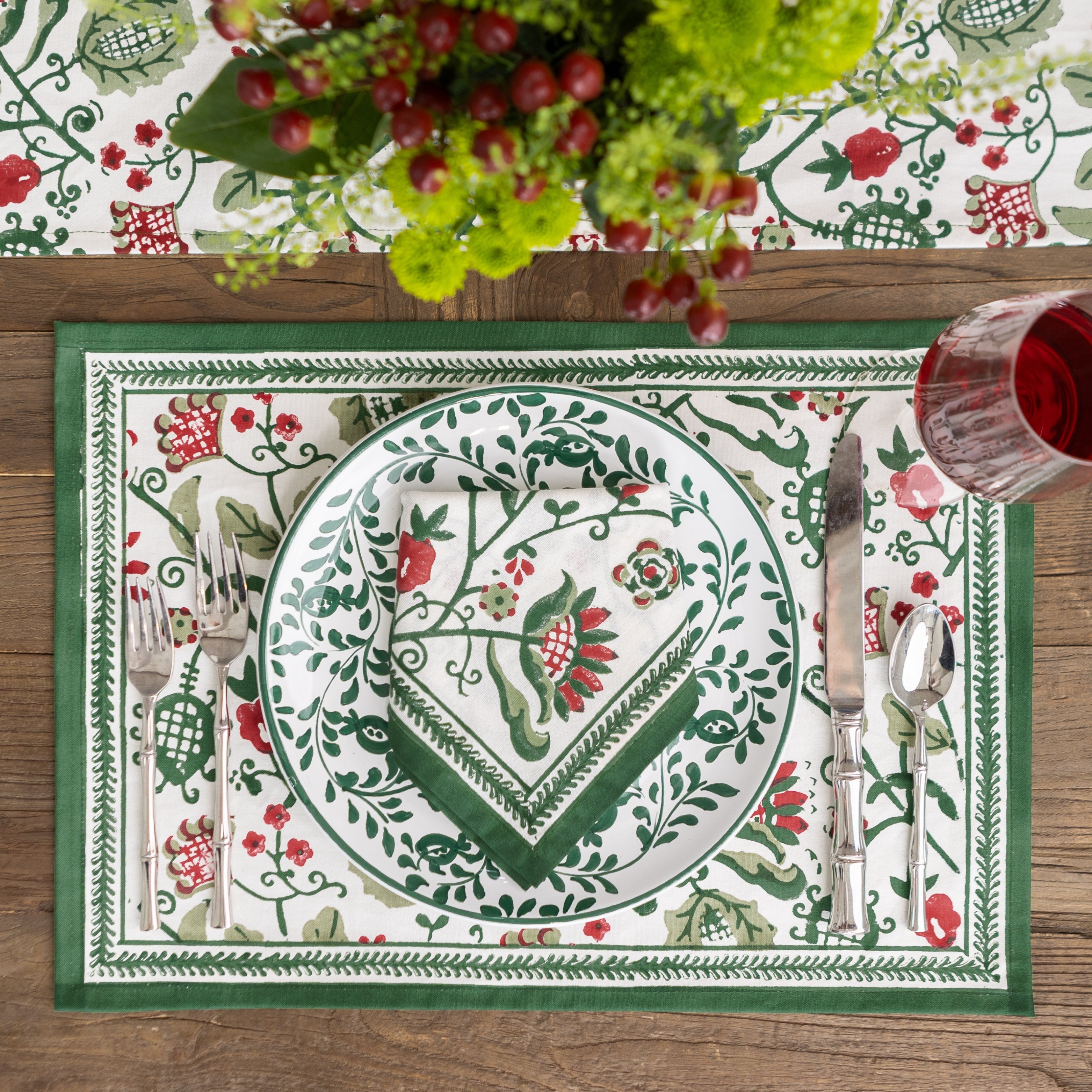 Bring timeless charm to your holiday table with our Con Con Red & Green Placemats. Hand block printed with intricate vines and blooming florals in festive shades of red and green, these cotton placemats set the scene for joyful gatherings. Whether layered with our Holly & Pinecone dinnerware or used on their own, they add a touch of artisanal elegance to every meal.
