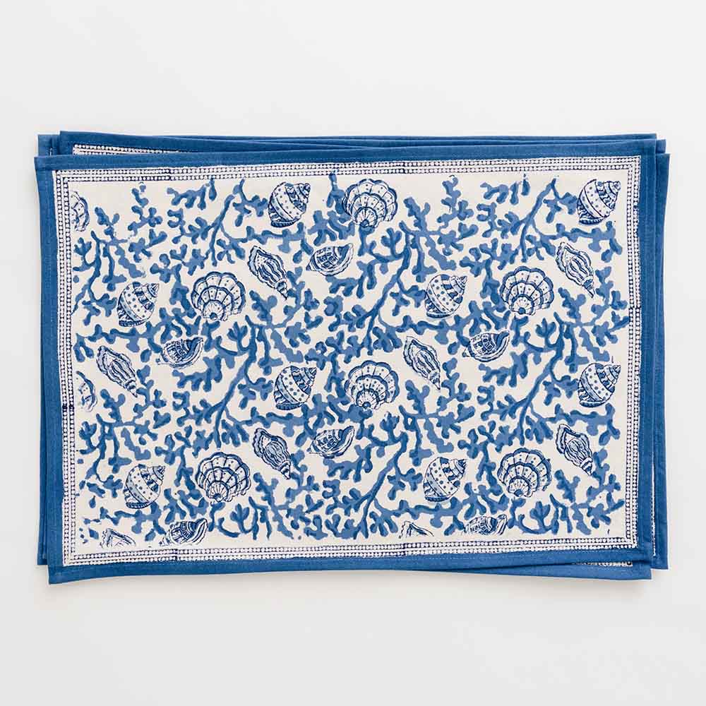 Blue and white coral and shells hand-painted and block printed to elevate your coastal home. For beachcombers and island dwellers, these exclusive hand block printed placemats are refreshing and refined; a lovely addition to liven up your table and home. Dress your table in our newest seaside print and pair it with the matching napkins and table runner to complete the look.