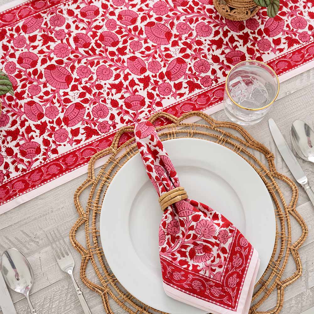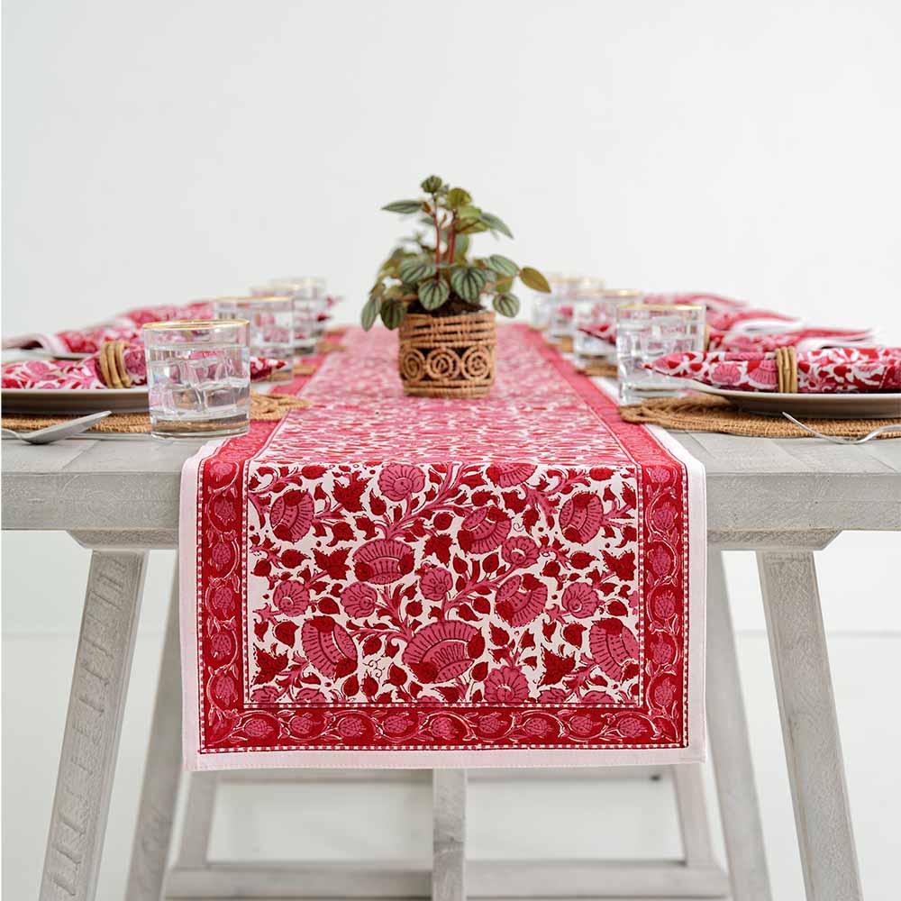 Refreshing spring blossoms! It is so easy to cheer up the family table with our exclusive pink floral block printed cotton table runner. A table runner is the most effortless way to set your table, immediately brightening it up! Elevate your everyday with Pomegranate's vibrant range of block printed home textiles including coordinating napkins, placemats and tablecloths.