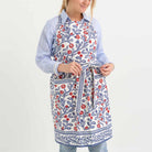 Our vintage Emma print has been going strong for over 25 years. This updated red, white and blue colorway is patriotic and all-American. Think Memorial Day and 4th of July, summer picnics and clam bakes. This pleated and pocketed apron is feminine and fun. Matching oven mitt set and tea towels complete the set.