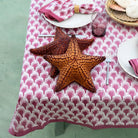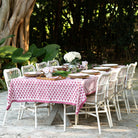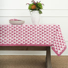 Add a pop of color and whimsy to your table with our Geo Feather Fuchsia Tablecloth. Hand block printed with a bohemian feather pattern in vibrant shades of pink, this tablecloth is sure to bring a playful touch to any gathering. Perfect for adding a unique touch to your dining experience.