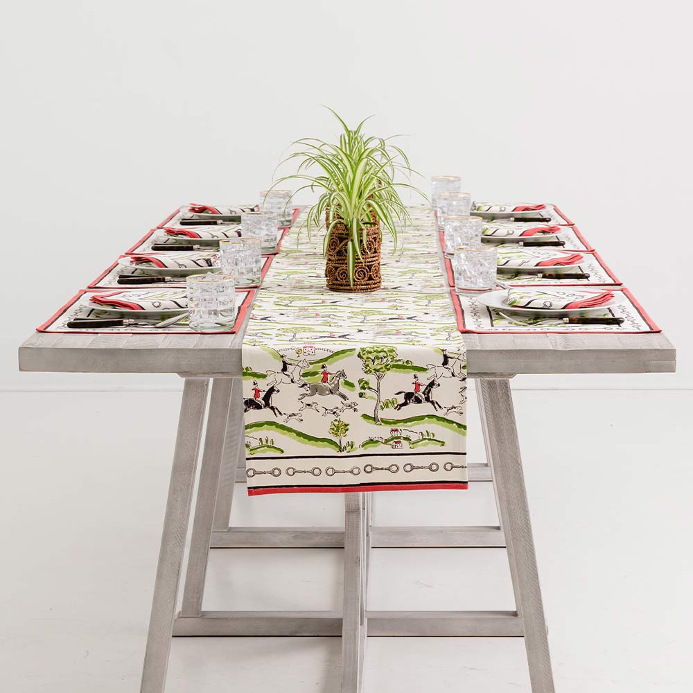 Off to the hunt! For the equestrian enthusiast, elevate your table scape with our exclusive equestrian hunt scene collection. Featuring our unique hunt scene print with red and snaffle, this table runner brings sophistication to everyday and formal gatherings. Shop our Equestrian Hunt Scene Collection today.