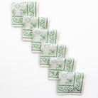 The delicate floral pattern from these tiles, now hand block printed in soothing Palladian Blue and Soft Sage, adorns these cocktail napkins. Ideal for both casual and formal gatherings, adding a touch of elegance to any setting.