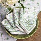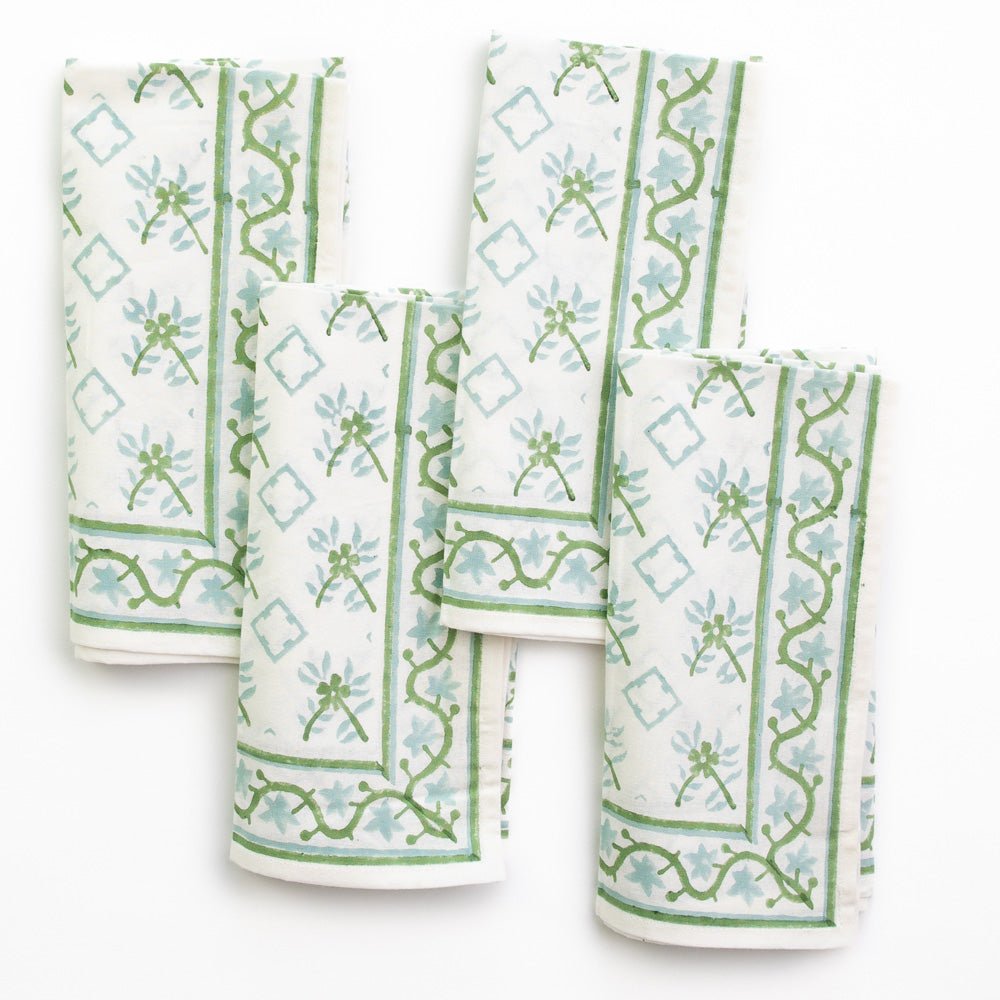 The delicate floral pattern from these tiles, now hand block printed in soothing Palladian Blue and Soft Sage, adorns these napkins. Ideal for both casual and formal gatherings, adding a touch of elegance to any setting.
