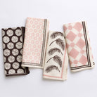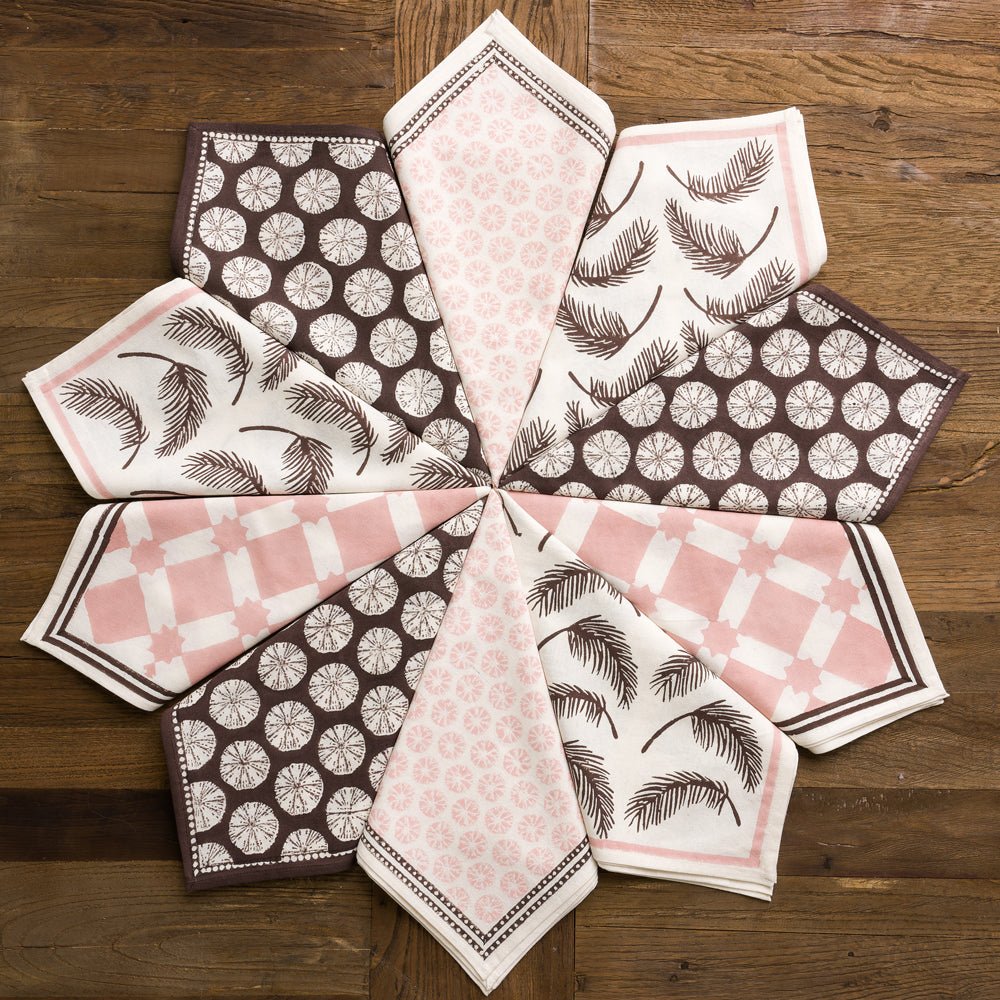 Handcrafted with creativity and care, this mixed set of soft blush and rich chocolate brown 100% cotton cloth napkins features a delightful array of patterns that pay homage to memories shared amid the pink sand beaches of Harbour Island. From the playful shadows of palm fronds, the intricately patterned sea biscuits, and a labyrinth of latticework found around the prettily colored wooden homes, each napkin captures a piece of an unforgettable love story.