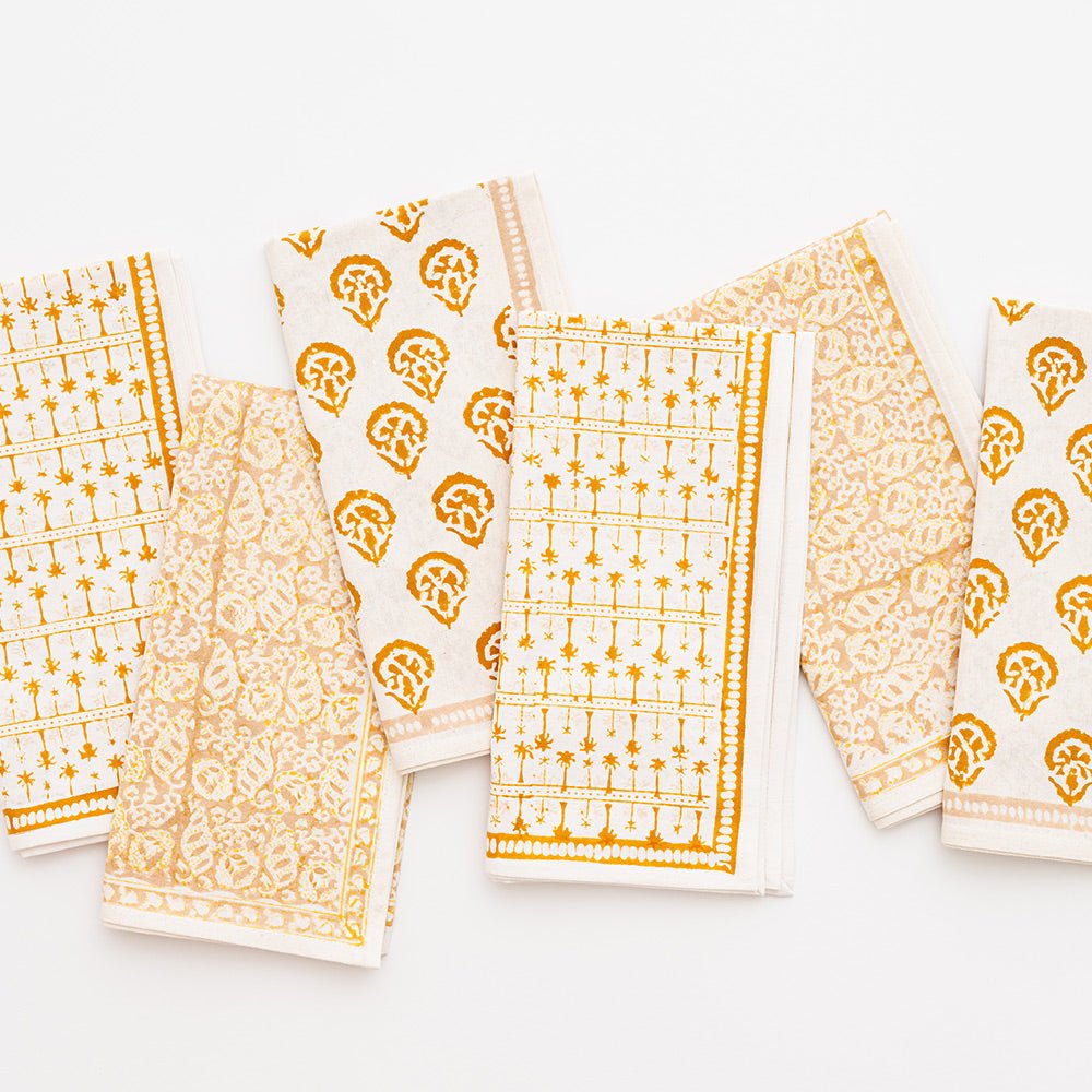 This beautiful mixed set of 100% cotton hand blocked printed napkins in golden are intended to be mixed haphazardly together, just as our families are.
