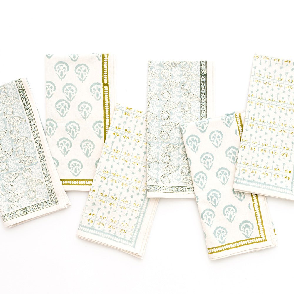 This beautiful mixed set of 100% cotton hand blocked printed napkins in seafoam are intended to be mixed haphazardly together, just as our families are.