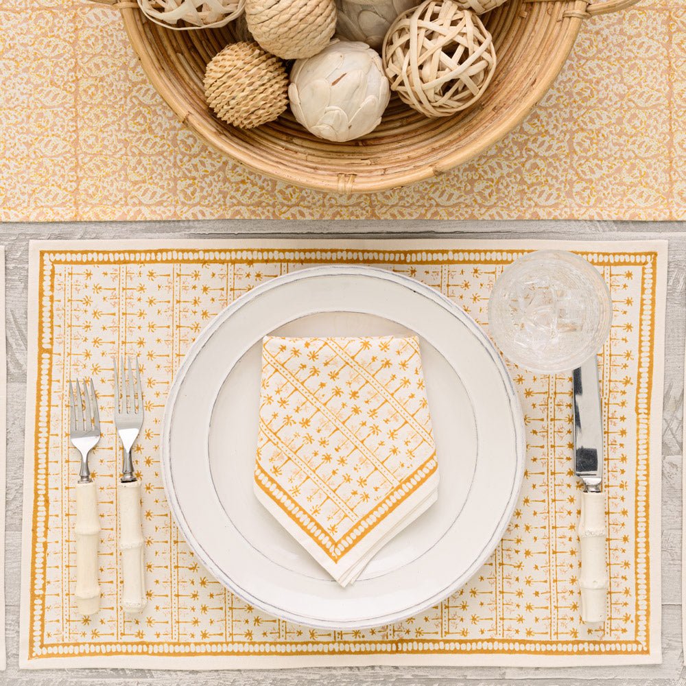 This beautiful set of 100% cotton hand blocked printed placemats in Palm Avenue Golden is intended to be mixed haphazardly together with the other patterns, just as our families are.