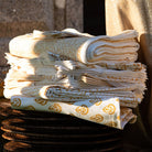 This beautiful set of 100% cotton hand blocked printed napkins in Seashell Golden is intended to be mixed haphazardly together with the other patterns, just as our families are.