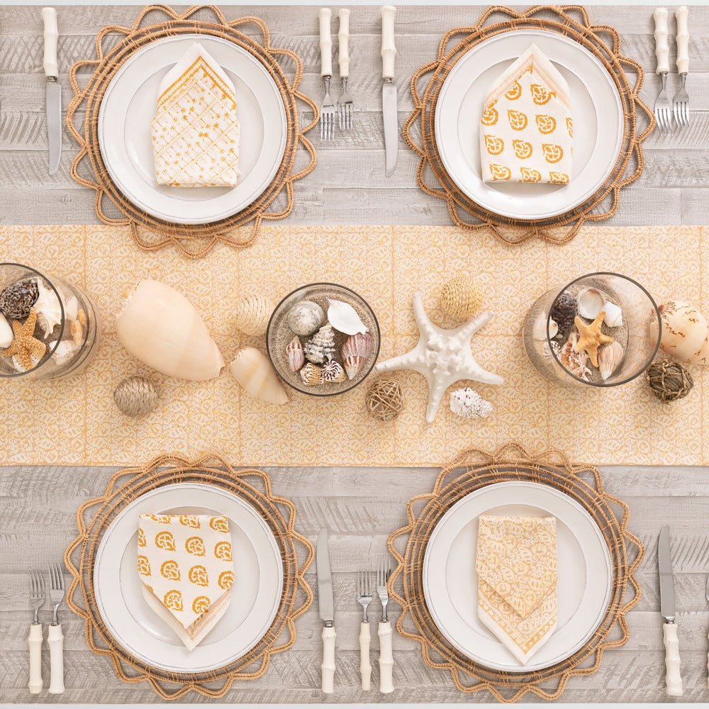 This beautiful 100% cotton, hand blocked printed Table Runner in Seashell Golden is intended to be mixed haphazardly together with the other patterns, just as our families are.