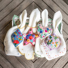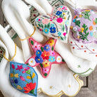 Celebrate the holidays with this colorful set of five ivory embroidered floral felt ornaments. This collection includes assorted shapes, each embroidered with delicate floral patterns in bright, cheerful hues. Great for gift exchanges with the girls or bringing a fun pop of color to your own tree. Each piece comes with a hanging loop, for easy decorating.