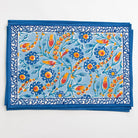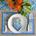 Inspired by the patterns of painted tiles found throughout Turkey, this print celebrates flower buds in rich blues and vibrant yellows and oranges. The placemats are edged with an abstract geometric pattern in two shades of blue and a solid blue border.