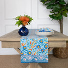 Inspired by the patterns of painted tiles found throughout Turkey, this print celebrates flower buds and blossoms in rich blues and vibrant yellows and oranges. The table runner is edged with a scalloped pattern in two shades of blue with a rambling vine and delicate leaves.