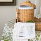 This charming set features two luxurious linen tea towels—one beautifully embroidered with a vibrant bottle of tequila and a refreshing margarita glass, complete with lime and salt accents. The second towel showcases a whimsical printed pattern of cocktail bottles and glasses in soft blue tones, adding a playful vibe. Scalloped edges give the set a delicate finishing touch, making these towels both functional and stylish.