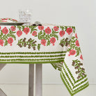 The sweet shape of young pomegranates inspired this print, which features the fruit in both its baby and mature stages. Lively tree branches with vibrant green leaves end with plump pomegranates in coral and salmon hues. This tablecloth pairs beautifully with the Pomegranate Green napkins and Natural Bamboo Cane Placemats.