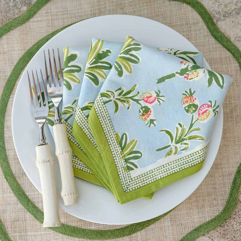 Tropical island palms and pineapples adorn this coastal themed light blue and green Pomegranate hand block printed cotton napkin. Complement your breakfast, lunch and dinner table with these refreshing and original table linens.