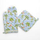 Tropical island palms and pineapples adorn this coastal themed light blue and green Pomegranate designed oven mitt set. Complement your kitchen with these refreshing and original kitchen textiles, that will liven up your cooking space. Complete the set with matching apron and tea towels.