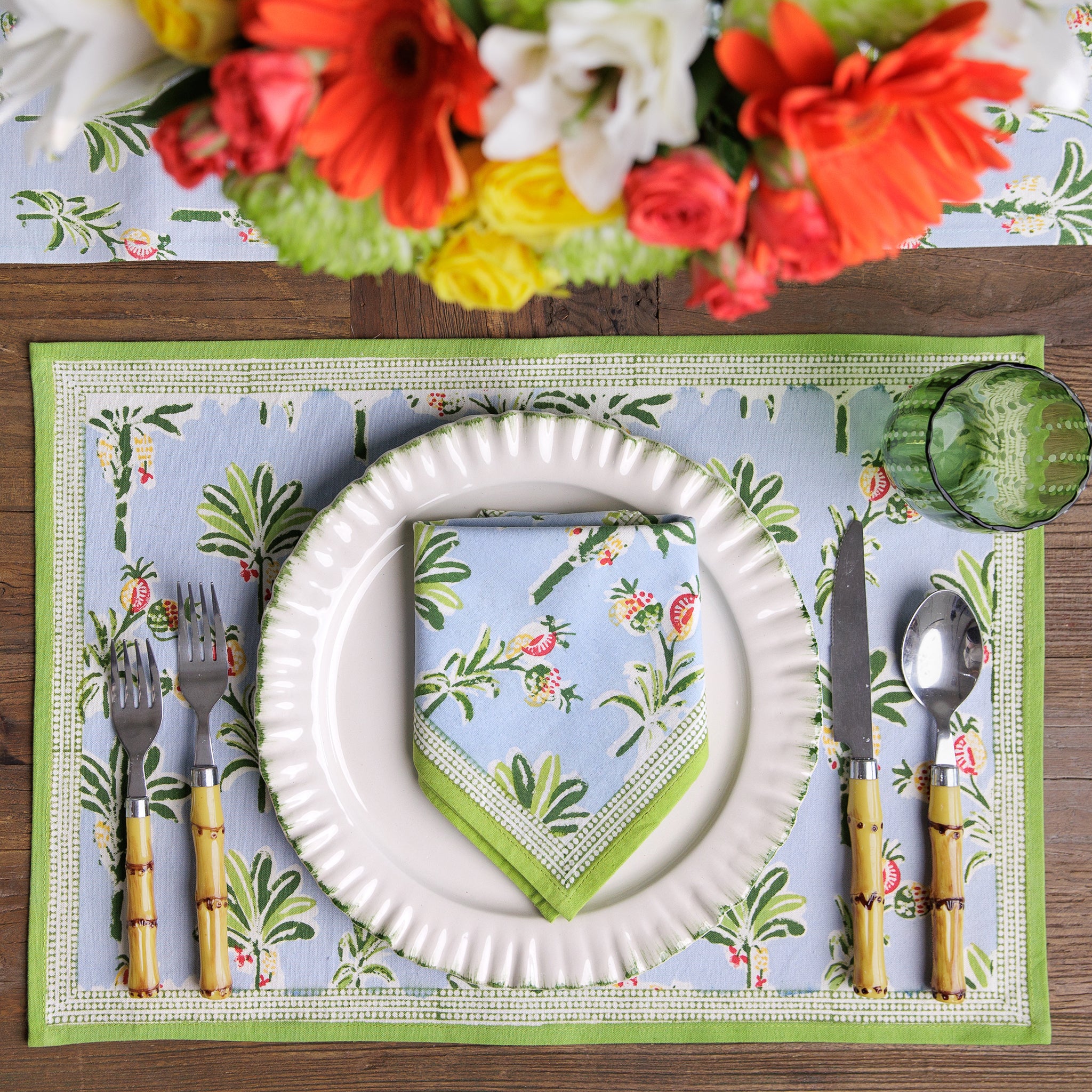 Tropical island palms and pineapples adorn this coastal themed light blue and green Pomegranate hand block printed cotton placemat. Complement your breakfast, lunch and dinner table with these refreshing and original table linens. Pair with matching napkins, table runners and tablecloths to complete the coastal look.