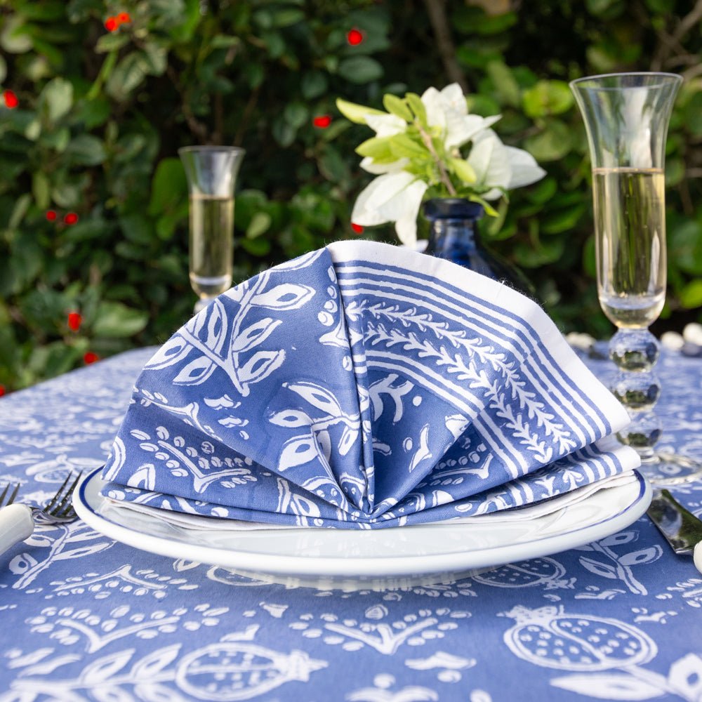Pomegranate Blue is our brand's signature print. Decorated in a distinctive, handpainted Pomegranate surrounded by lively fleurettes and a complimentary border, these napkins add an at-home and welcoming look to your table setting. Sold in sets of 4.