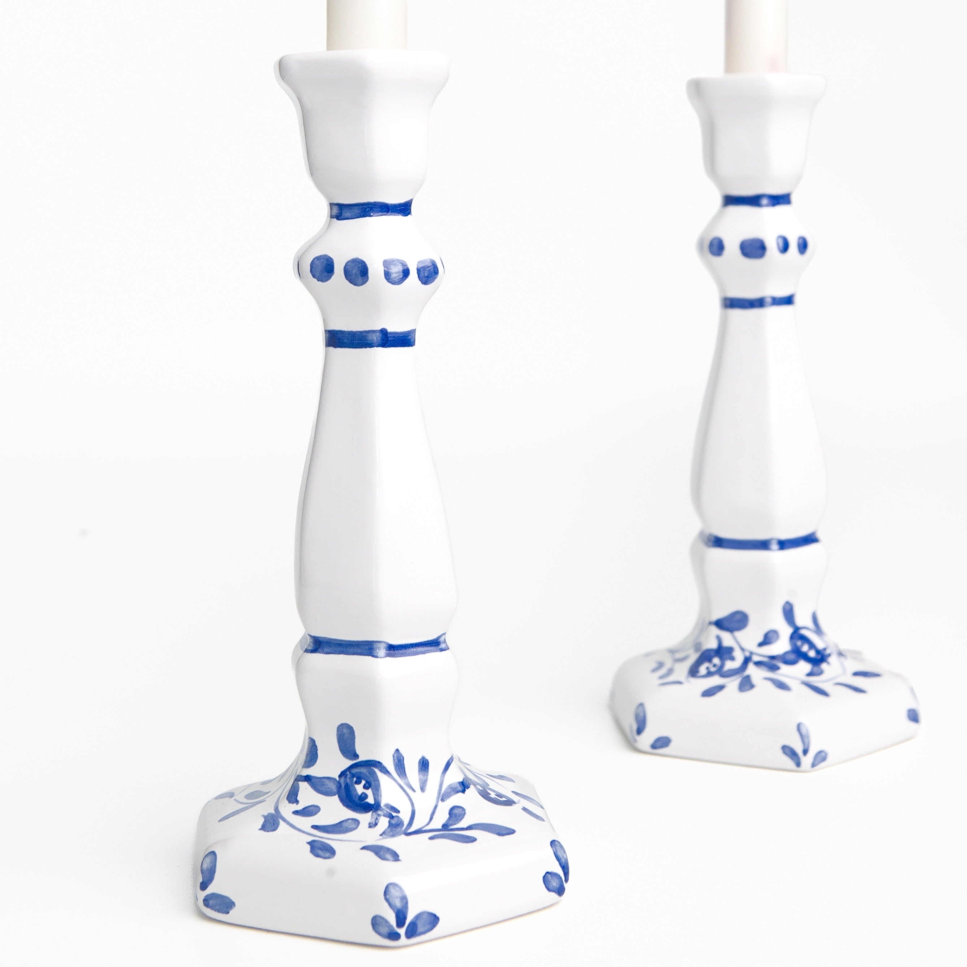 Illuminate your gatherings with our Pomegranate Scroll Candlesticks in Blue. Hand-painted with scrolling vines and stylized pomegranates, this pair brings warmth and artistry to any tablescape. Whether styled alone or flanking a centerpiece, they add height, pattern, and glow in every colorway.