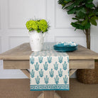 Elevate your table decor with the Sagar Aqua Table Runner. Featuring an exquisite hand block printed design in soothing aqua tones, this table runner adds a touch of elegance and charm to any dining setting. Made from 100% cotton, it is both durable and machine washable, making it a practical and stylish accessory for your dining table, whether you're hosting a casual brunch or a formal dinner.