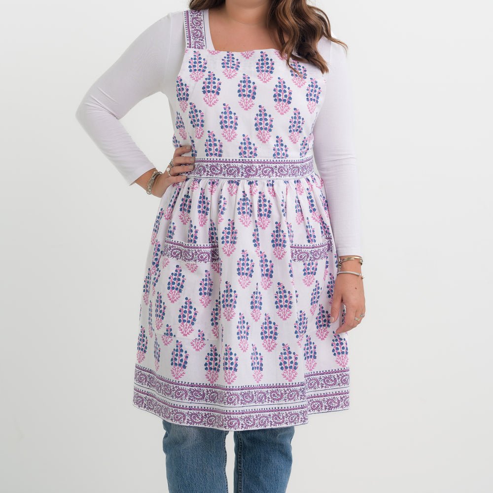 Inspired by the Sagar District of central India, a region of rich culture and beautiful architecture and nature, this print is one of our most popular. The rich blue and vibrant magenta colors create a palette that is equal parts soothing and luxurious. This apron will add a lovely vibe to your kitchen. This beautiful and unique apron is sure to cheer up your everyday kitchen, and it makes the perfect gift for your favorite cooking enthusiast.