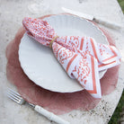 This updated traditional classic red and white hand block printed Tapestry Persimmon napkin was designed to symbolize the weaving of stories that are shared during meals. Explore conversations with family, friends, and guests that remind us of the beauty of details and encapsulates the tapestry of your entertaining.