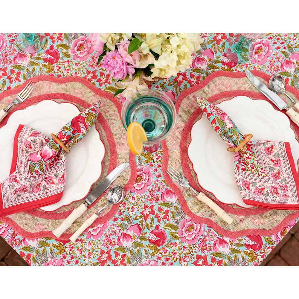 Colorful, cheerful, and perfect for the spring/summer season! Intriguing as a true wildflower garden, this collection features an array of pinks on a sky blue background with pops of lime green creating the perfect feminine pattern. These cotton napkins brighten up your table and simplify setting the table. Match with coordinating tablecloths, placemats, or table runner for a vibrant floral look.